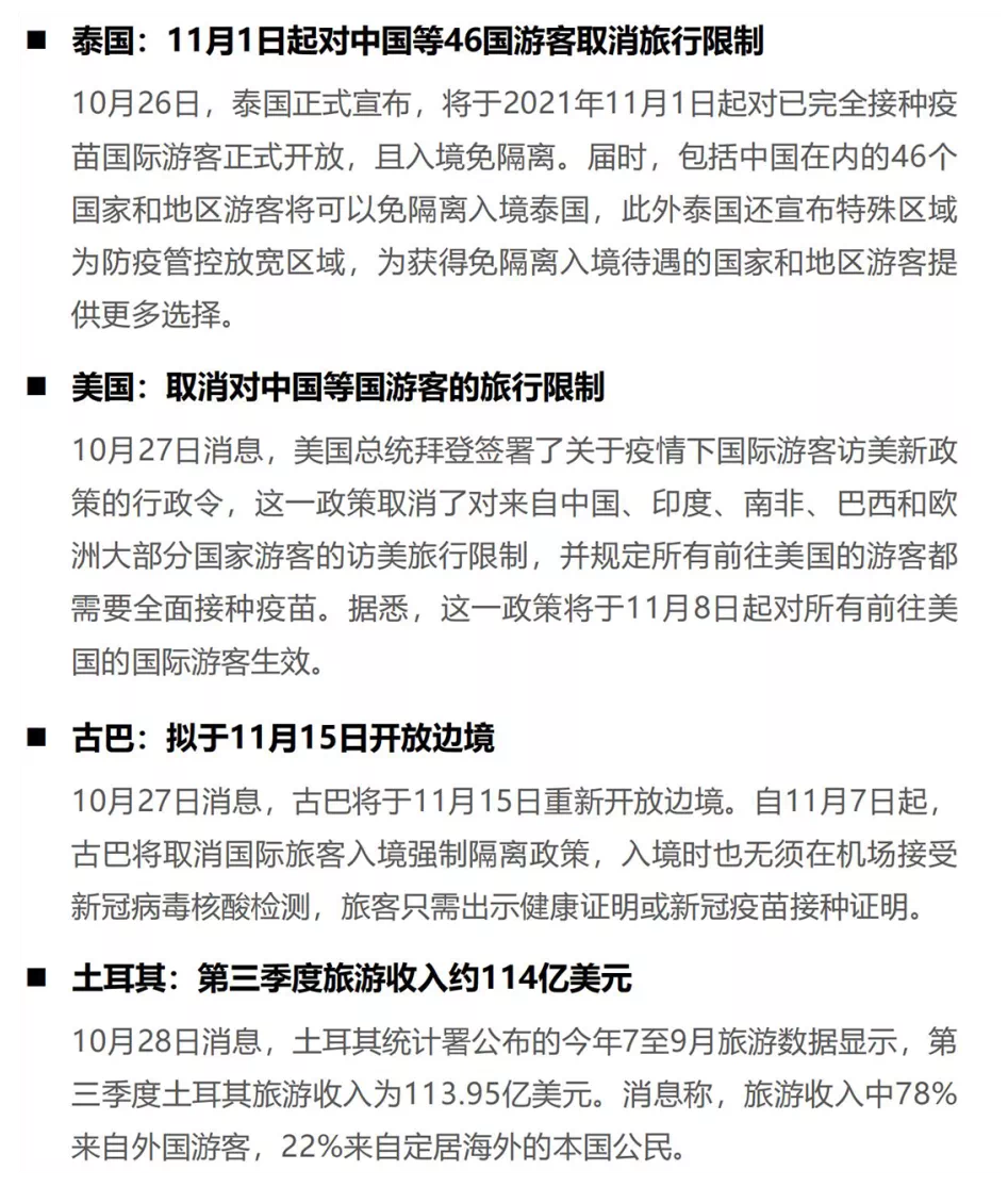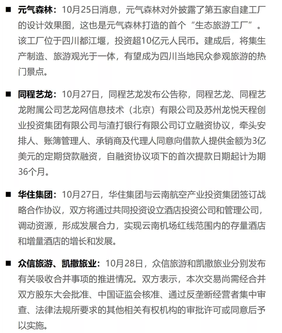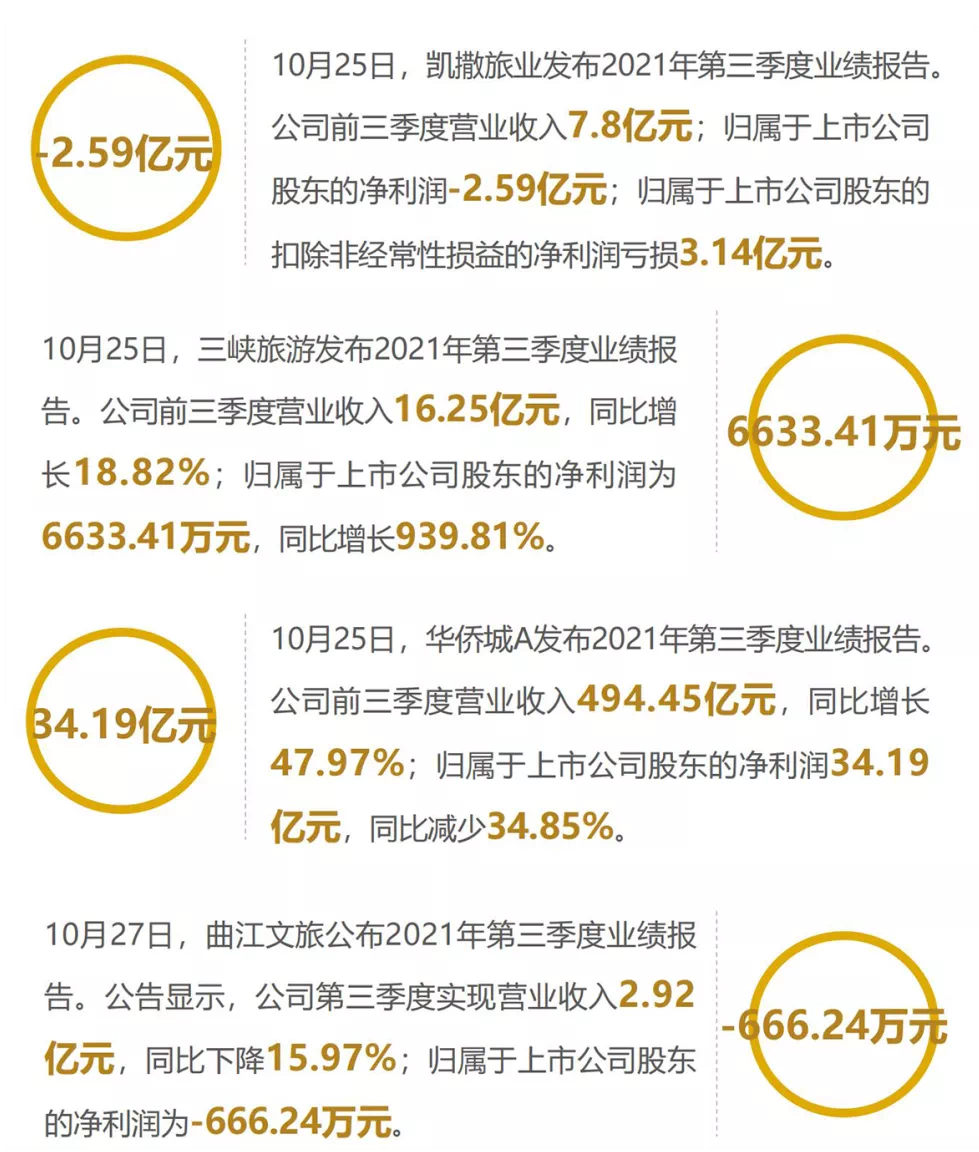 本周,多家上市旅游企业发布了第三季度业绩报告。疫情冲击下,不少旅企出现业绩滑坡,如华侨城净利润同比下降34.85%,丽江股份净利润同比下降77.40%。此外还有部分旅企出现不同程度的亏损,其中凯撒旅业前三季度净亏2.59亿元,众信旅游前三季度净亏2.05亿元,可见旅行社板块依旧是亏损重地。而受到新一轮疫情影响,文旅行业、企业的颓势恐将进一步持续。