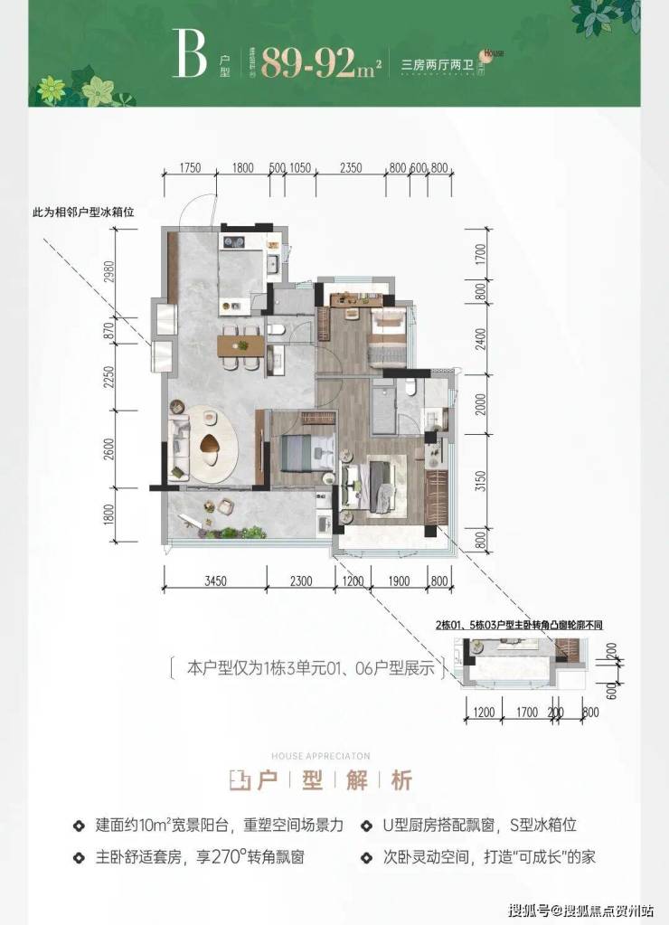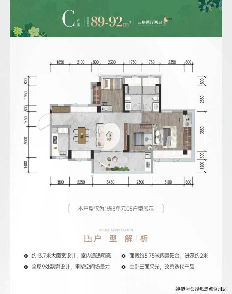 92㎡三房二卫(横厅):440-493万 ,拓展后实际使用率约102%-105%;