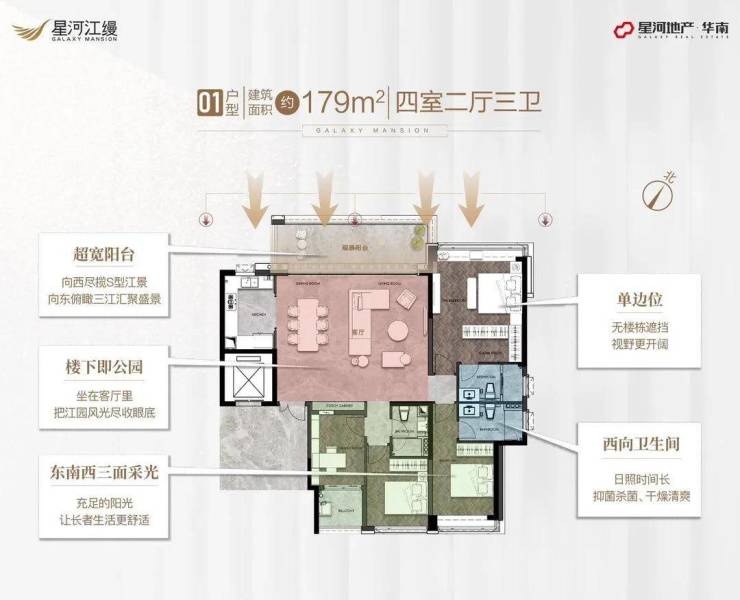 1、2、3栋的面积段均为179㎡,4栋的211㎡,4栋是星河江缦总层最高的一栋,30层高,南北都能望江,白天鹅楼栋也能映入眼帘,其中5层以上是住宅区,1-4层为业主会所,诸如健身房、高尔夫球练习室、茶室、共享厨房等功能区。