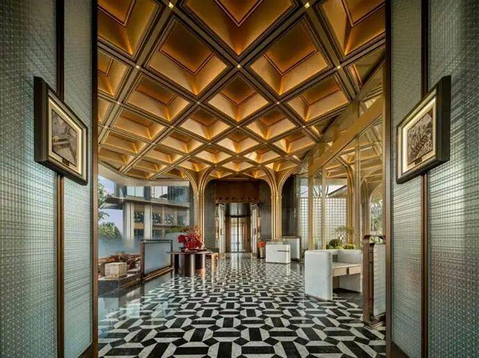 宝格丽酒店式大堂、采用下沉式设计,金色格栅与水刀拼花的典雅地面,营造奢雅质感,仿佛置身上海宝格丽酒店的私享秘境。