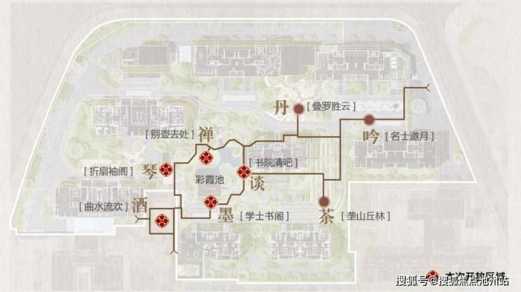如《园冶》所言“池上理山,园中第一胜也”,【彩霞池】作为中央景观区的空间焦点,以其形态的不拘,通过倒影延伸意境。“聚气藏风”,既有围合感与静观之美,有清风拂过时,漾动一池碎金,又添了几分自然逸趣。