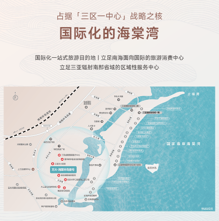周边配套:项目与海边直线距离约 1 公里,周边有人大附中等优质教育资源,以及国际免税城、亚特兰蒂斯酒店、超级万象城、太古里购物中心等商业配套。1 公里生活圈内还有解放军总医院海南医院、北大口腔医院、新加坡鹏瑞利医院等医疗资源。