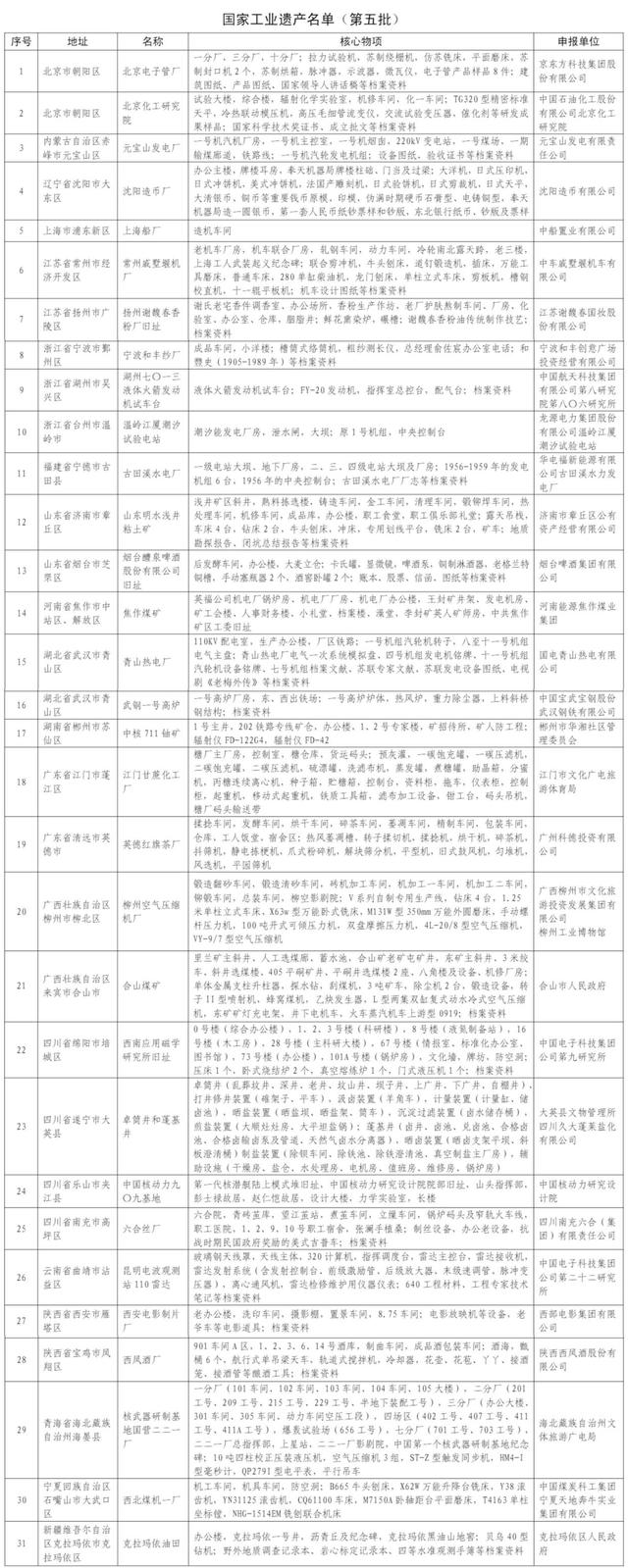 经工业遗产所有权人自愿申请、相关省级工业和信息化主管部门或中央企业推荐、专家评审、现场核查和网上公示等程序,确定了第五批国家工业遗产名单,现予以公布。