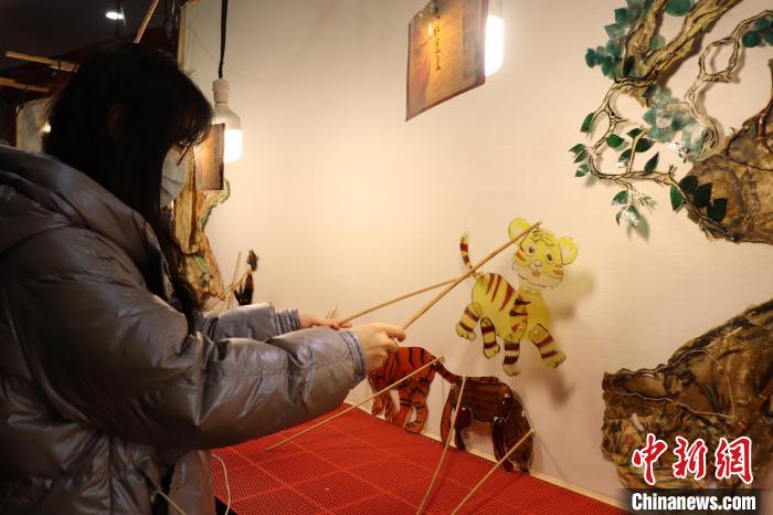 媒体记者亲自体验泰山皮影。 李明芮 摄