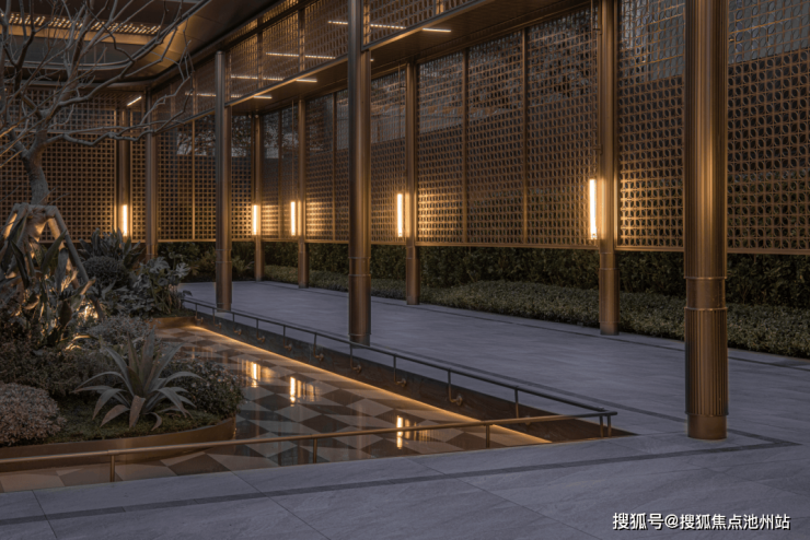 穿过大堂之后是艺术风雨连廊,艺术连廊的设计让业主下雨天也能在园区自由漫步,连廊以镂空线雕工艺打造“锦上添花”金属垂帘,更显精致风雅,艺术连廊与小区园林及水景交融,带来度假般的松弛感。