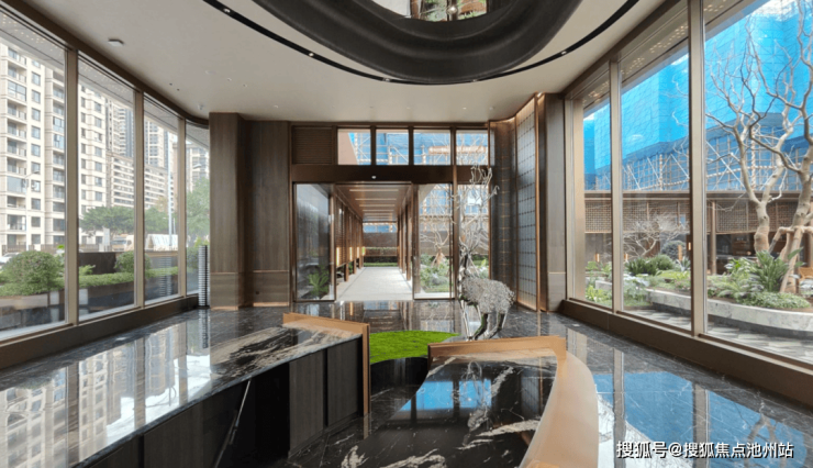 小区采用酒店式归家大堂设计,开发商不惜成本采用了大面积落地玻璃,让视野景观更通透。大堂中心艺术造型的前台、精致的雕塑和艺术吊顶相呼应,给人以出入星级酒店的尊崇感。