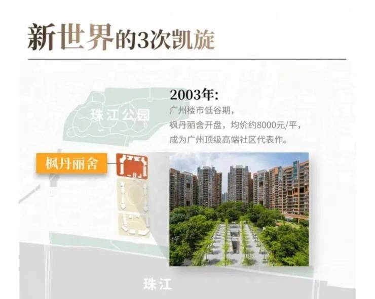 所以,我们能看到,像琶洲西区、金融城等地块,接连陆续拍出6.7万/㎡,7.6万/㎡的广州前二地价。但是当时的珠江新城,当时的凯旋新世界,并没有模板可抄。也正是因为有了新世界中国领先世界的眼光、超前的规划理念、坚定的发展魄力,才造就了今天凯旋新世界的经典。新世界的第一次凯旋,是在2003年。彼时的广州,正值非典时期,也是楼市低谷期,全市平均房价不过约3173元/平。同年,凯旋新世界一期枫丹丽舍开盘,以约8000元/平的均价,成为广州顶级高端社区的代表作。