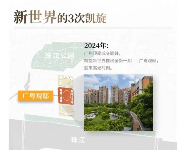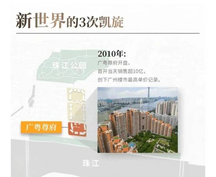 新世界的第二次凯旋,在2010年。2007年,美国爆发次贷危机,继而演化为全球金融危机,楼市行情平稳。2010年,凯旋新世界广粤尊府首开,当天销售超10亿,一举创下广州楼市的最高单价记录。也正是这一年,广州楼价达到历史巅峰,涨幅为38%。