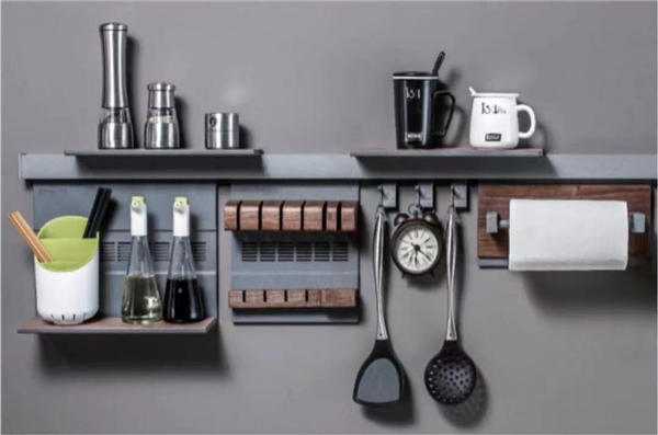 除了利用厨柜收纳以外,还可以采购一些厨房的收纳神器,比如五金挂件等,利用墙面少有位置安装隔板、挂杆、挂钩,放置做饭常用的调味料、铲子、抹布等物品,这样的设计,不仅释放了厨柜的和台面的压力,也能厨房空间更显清爽整洁,做起饭来更轻松。