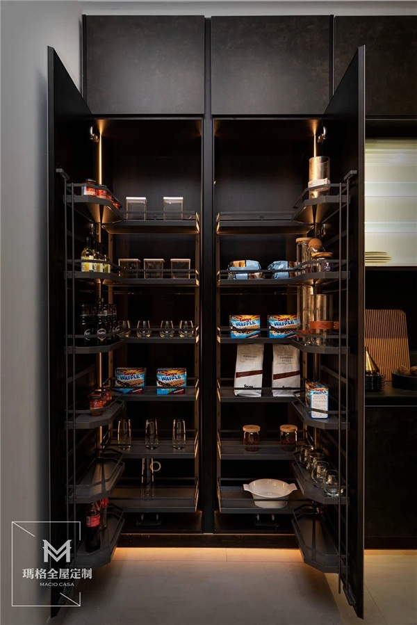 除了上下柜收纳以外,还有立柜的设计也很重要,可以利用立柜的纵深空间设计高深连动拉篮,开门轻轻一拉,物品便近在眼前,柜内深处的物品也能轻松拿取,高级又美观,收纳能力满分。