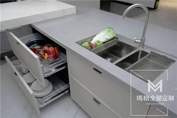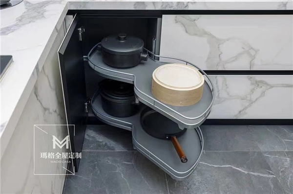 通常厨柜的设计都无可避免出现“死角”,但千万不要忽略这个死角,巧妙设计一个转角拉篮,将空间充分利用起来;使用的时候只需轻轻一拉就能旋转出来,上面放置各种锅碗瓢盆,使用起来更方便。