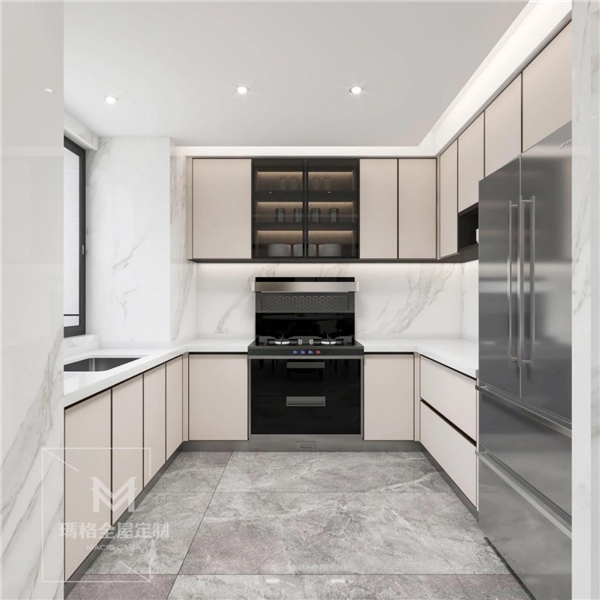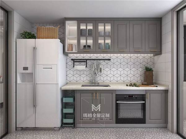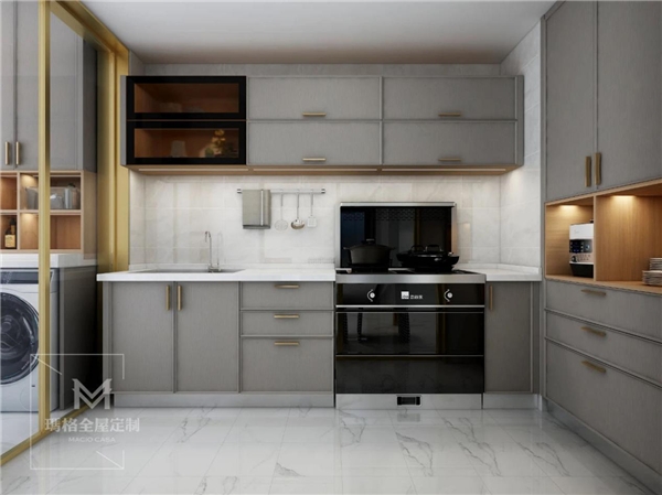 吊柜位于操作台上方,设计的尺寸要符合人体工程原理,为了让吊柜使用起来更加方便,可设计一些上翻柜门,开合更快捷;还可以适当设计透明玻璃柜门、镂空隔板等,嵌入灯光,提升厨柜质感,拿取物品一目了然。