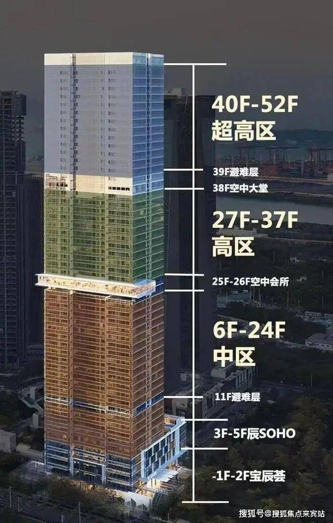 华侨城宝辰总高230米,为宝中最高楼;项目52层,分为中区、高区、超高区,6层起卖,11、39F为避难层,25-26F为空中会所,28F为空中大堂。除了空中大堂项目还有地下入库大堂+首层大堂,一共三重大堂。