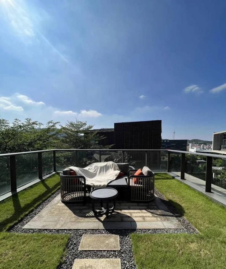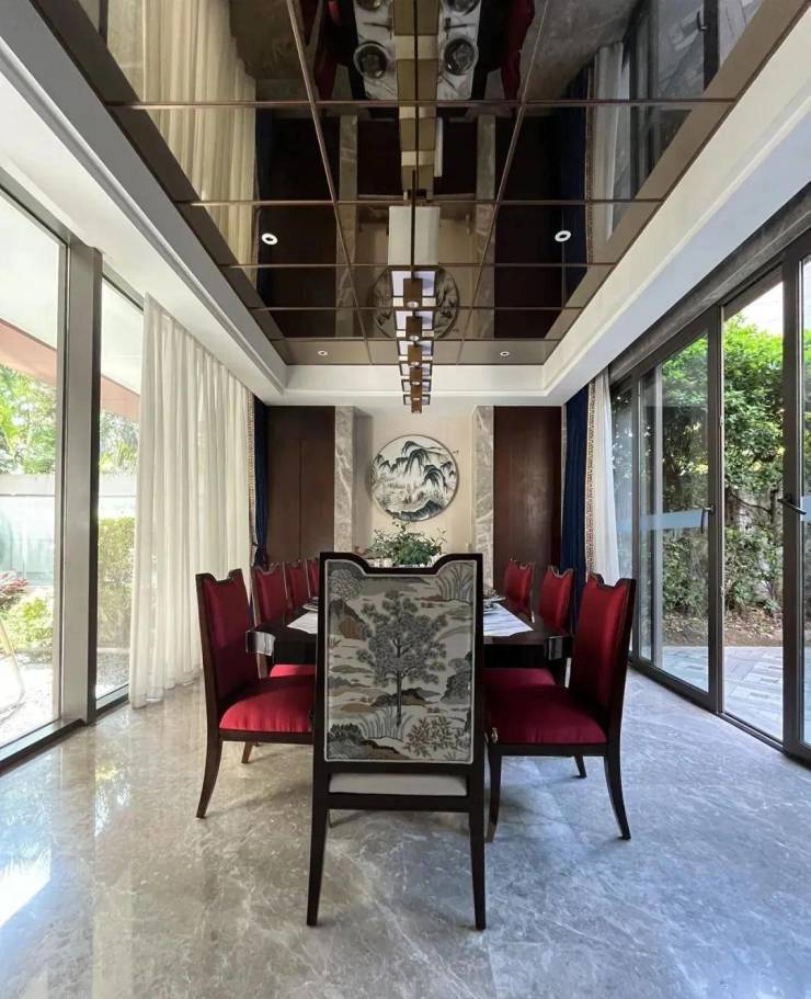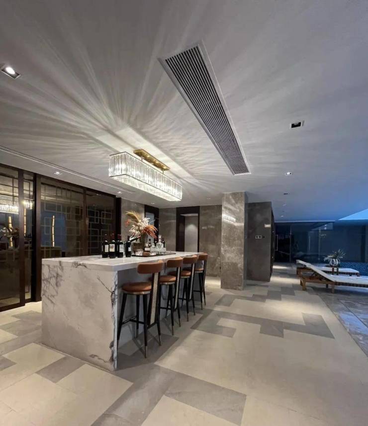 约6.9米挑高会客厅,落地玻璃的设计,在放大空间的尺度感之余,将更多白云山的自然生命力延伸进生活。室内与室外的连接与隔断、结合光影线景构筑次序空间,浪漫的表达出缓慢与轻盈的优雅生活。