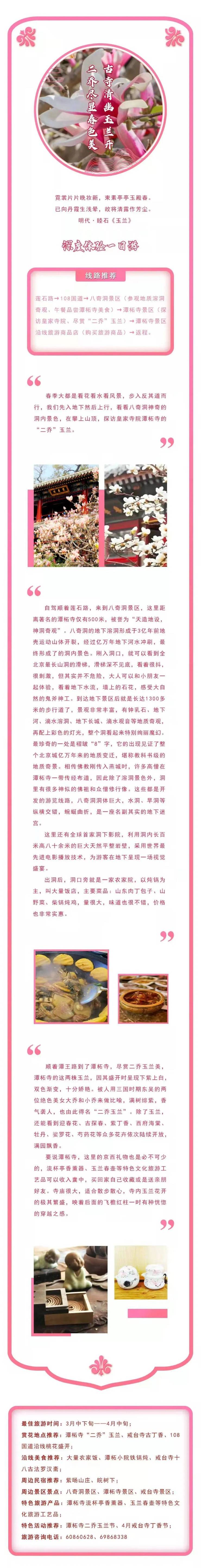 莲石路→108国道→八奇洞景区(参观地质溶洞奇观、午餐品尝潭柘寺美食)→潭柘寺景区(探访皇家寺院、尽赏“二乔”玉兰)→潭柘寺景区沿线旅游商品店→返程