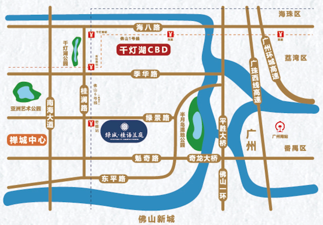 季华路、魁奇路、桂澜路等六纵六横路网交错环绕,15分钟畅达祖庙、千灯湖,半小时畅达广佛各主城中心区。