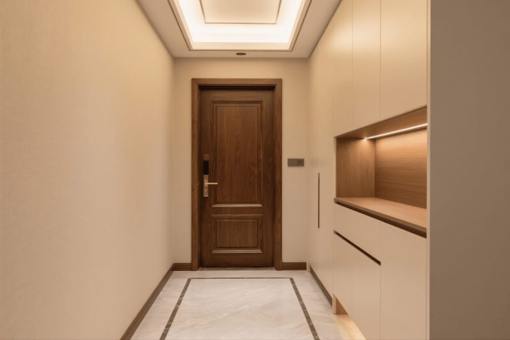 整个公区的连贯墙面打造了凹墙设计,从玄关延伸至客厅,形成全家的隐藏式储物系统。