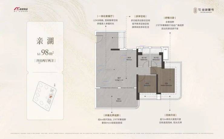 在售户型涵盖 四居室户型,98㎡四房单价与两居室相近,采用全南向设计,部分带有 270° 全景飘窗;