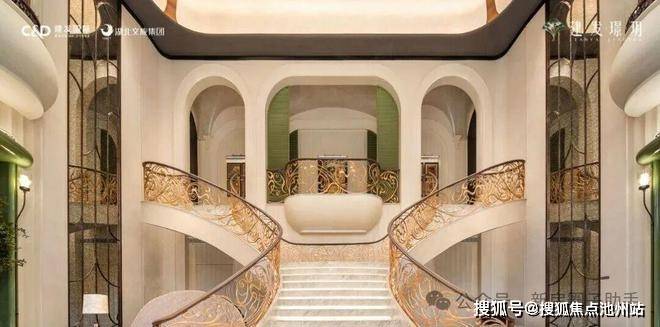 穿过大门就进入了挑高约10米的中庭,这里也是会所的接待大堂,借鉴了厦门千万级豪宅宸启瑞湖的海派美学基因。花瓣式艺术吊灯、南洋釉彩地砖、Art Deco珐琅彩玻璃、双向旋转楼梯......每一处细节,都是对卓越品位的精准表达。