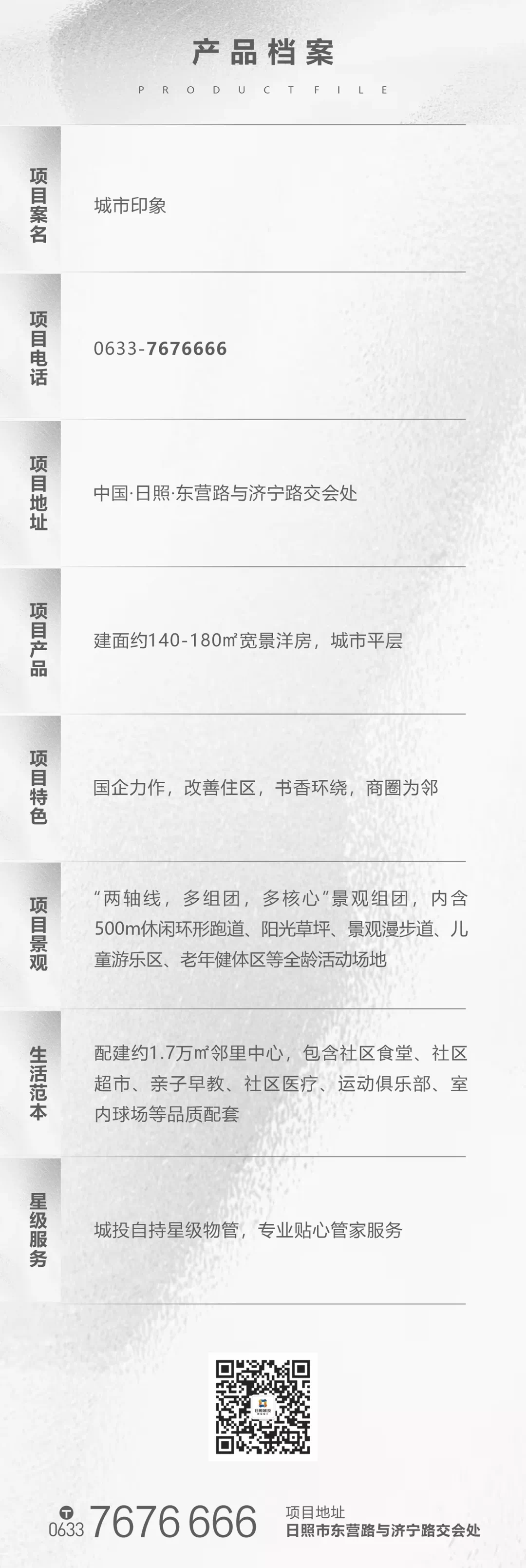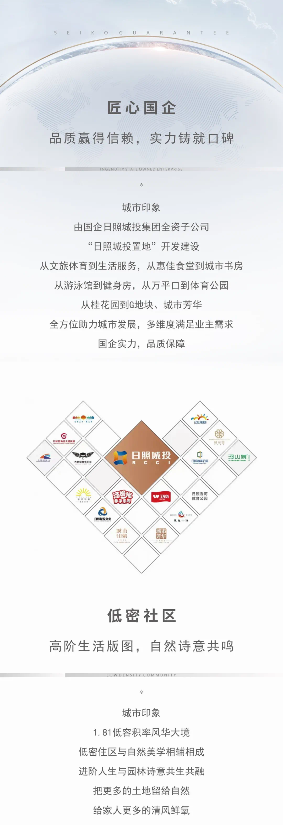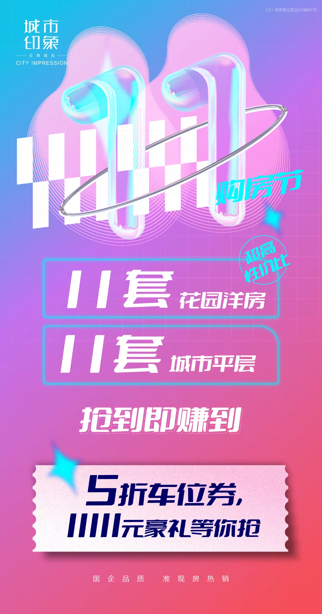 1.本项目推广名为“城市印象”,开发商为:日照城投置地有限公司。(日)房预售证第202108042号。(日)房预售证第202108043号。(日)房预售证第202108041号。2.本资料为要约邀请,不作为要约或承诺。相关宣传内容不排除因政府相关规则、规定及出卖人分期规划、未能控制等原因而发生变化。3.出卖人可能会不定期对宣传材料进行修改。买卖双方的权利义务以双方签订的《商品房买卖合同》及补充协议、附件等书面文件为准。本资料所发生的内容为2021年11月11日前的信息,敬请留意较新资料。4.本宣传资料所涉及的户型仅供示意参考,其装修、家具、陈设等非交付标准,不属于交付范围。不同户型的面积尺寸、功能布局、空间分割、门窗/管井形态位置等均有不同。相同户型因楼栋、楼层、单元等差别,局部结构、面积等也可能不同,具体以政府部门最终审定的图纸和销售合同为准。5. 本宣传资料中,独立门厅为公共使用空间。6.本文部分图片源自网络、部分来自活动现场,素材、版权属于原作者,转载素材仅供大家欣赏和分享;因编辑需要文字和图片之间亦无必然联系,仅供读者参考。7.日照城投置地有限公司享有法律法规许可范围内解释权。