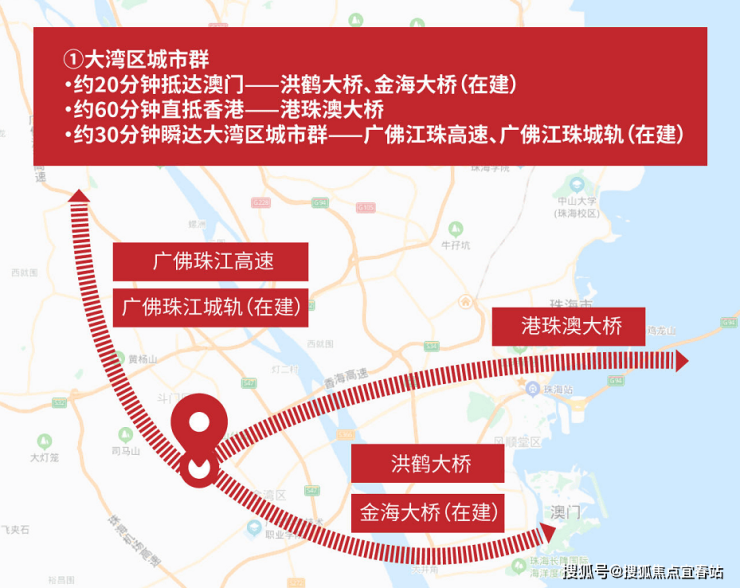 ④金海大桥(30分钟车程):直达横琴大道,经口岸半小时通达澳门,预计22年具备通车条件