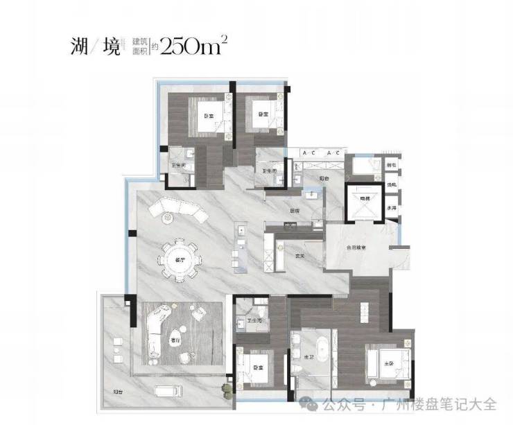 250㎡-四房两厅四卫——全套房设计、一线望日月双湖、122方定制化三厅设计、18.9米南向面宽、15米长L形阳台、奢华酒店大主套、主仆分离动线