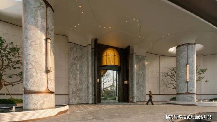 在棱角分明、现代感十足的建筑群中,设计以跳脱周围环境的独特曲线、充满未来感的结构美学,塑造归家入口悬浮屋檐的整体形态,用来呼应钱塘江浪潮的澎湃、金沙湖水波的柔美,从而表现出更多“去住宅化”的质感。