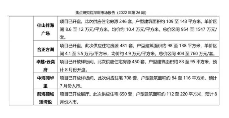 当周3个项目入市。其中,位于福田的天健天骄西筑,供应住宅房源49套,户型建筑面积约78至151平方米,单价区间10.4至12.9万元/平方米,均价约11.6万元/平方米,总价区间832至1825万元/套;位于南山的伴山伴海广场,供应住宅房源246套,户型建筑面积约109至143平方米,单价区间8.6至12万元/平方米,均价约10.4万元/平方米,总价区间954至1547万元/套;位于龙岗的合正方洲,供应住宅房源481套,户型建筑面积约98至138平方米,单价区间4.1至5.5万元/平方米,均价约4.9万元/平方米,总价区间404至760万元/套。