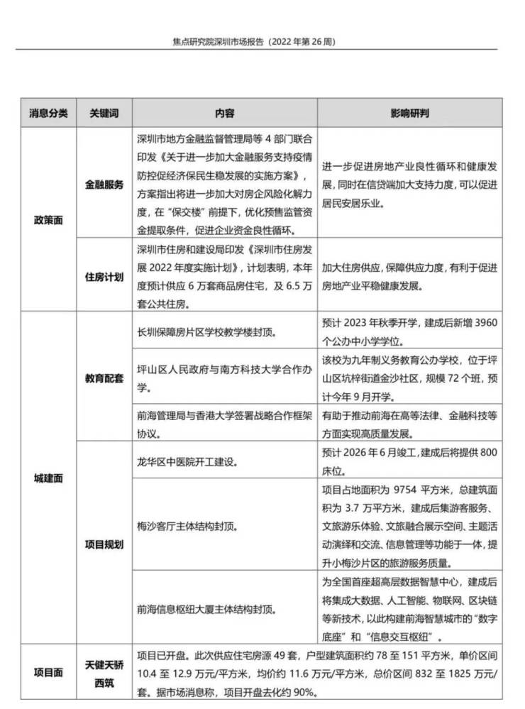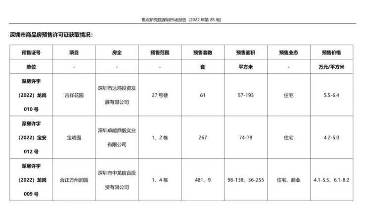 市场运行方面,当周3个住宅项目获取商品房预售许可证。其中,位于龙岗的吉祥花园,备案住宅房源61套,户型建筑面积57至193平方米,价格约5.5至6.4万元/平方米;位于龙岗的合正方洲,备案住宅房源481套,户型建筑面积约98至138平方米,价格约4.1至5.5万元/平方米;位于宝安的宝珺园,备案住宅房源267套,户型建筑面积约74至78平方米,价格约4.2至5.0万元/平方米。