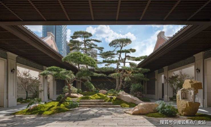 几棵松树与原石点缀在天井天光下,形态自然。厚重的铁艺大门、珐琅格栅的光影,乃至“天马”图腾的喷泉,共同营造出一种笃定而安然的氛围。