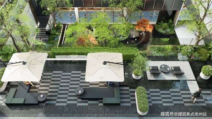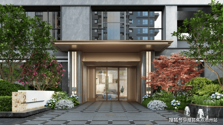 在选材上,不惜工本,投入巨大。安哥拉黑、福鼎黑、迪奥米黄石材等一一安排,绿植特选罗汉松、朴树等,再搭配叠级水景、艺术花境等,营造出伴水归家的礼序。