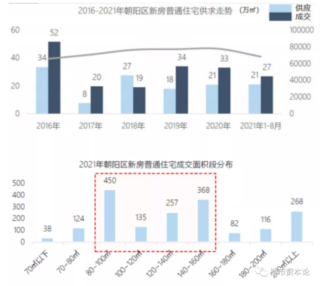 数据显示,自2016年以来,整个朝阳区的新房供应量就连年低于成交量,其中对高端改善产品的需求尤为旺盛,2021年朝阳区新房成交数据中,140-160平米面积段仅次于80-100平米面积段,是70-80平米面积段(刚需户型)的3倍。