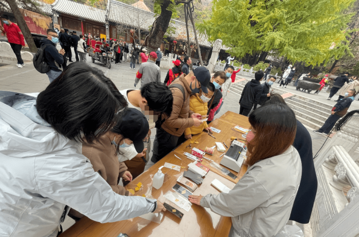 据介绍,游客可以在景区内捡拾喜欢的银杏叶粘贴在卡片上,并写下心愿和祝福,经过景区工作人员现场加工,制作成书签、银杏叶创意画和激光雕刻亚克力摆件等。另外,银杏节期间,景区还推出了与潭柘寺相关的文创甜品和咖啡饮品,包括“柏事如意”巧克力布朗尼蛋糕、“一叶知秋”树莓水果慕斯蛋糕等。