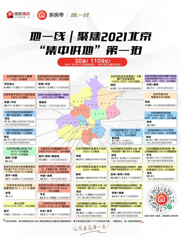 最终,加上4月23日1宗招标地块以及5月8日底价成交的4宗地块,北京此次集中供应的30宗地总成交价达1109.71亿元。