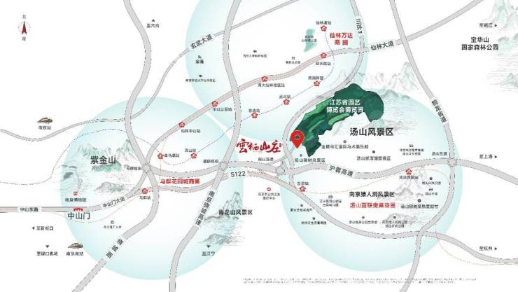 项目位居紫金山东脉,于汤山新城、麒麟新城、青龙地铁小镇核心交汇处 ,坐享紫东新区城市绿肺。