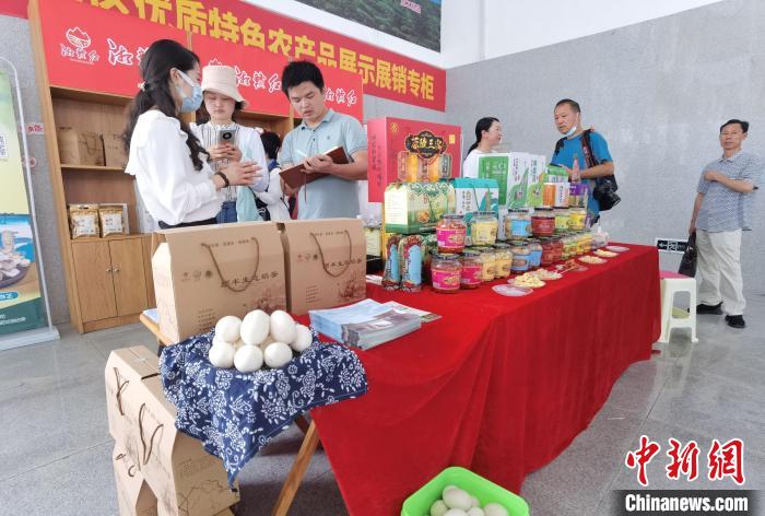 在茶陵南火车站候车室,摆放着许多“湘赣红”农产品。 向一鹏 摄