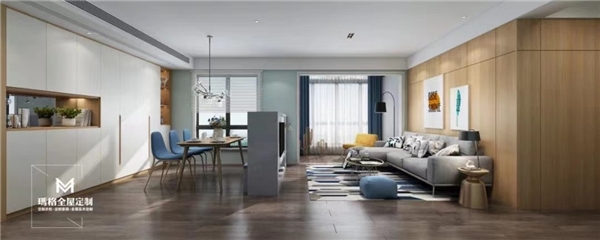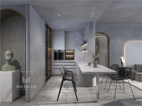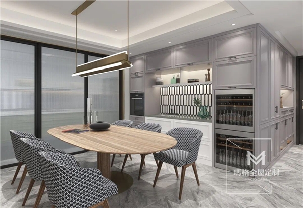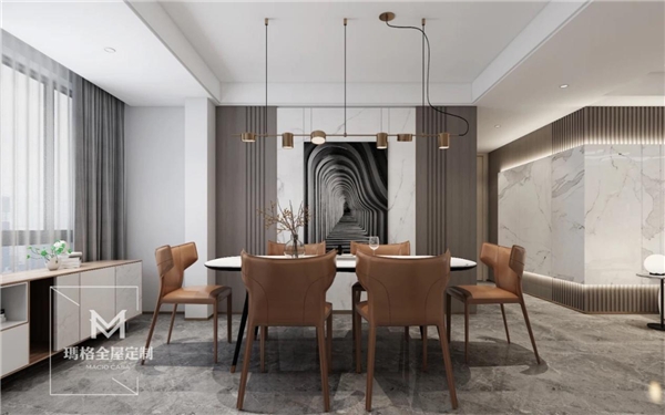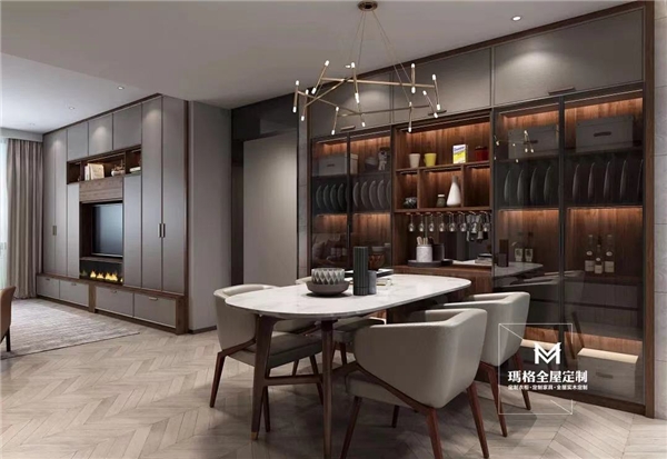如果餐厅一侧非承重墙,可以把这面墙用定制餐边柜代替;嵌入型的餐边柜既不占用多余空间,又与墙体形成一字排面,用餐空间凸显宽敞整洁。
