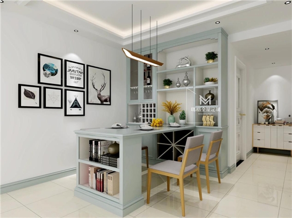 设计餐桌、餐边柜一体组合型,餐边柜与餐桌交汇的下部分,用于放置不常用的物品;柜子上方安装隔板,摆放饰品和收纳餐具;书桌的另外一段设计小型收纳区,放置书籍等,增加客厅的收纳空间。