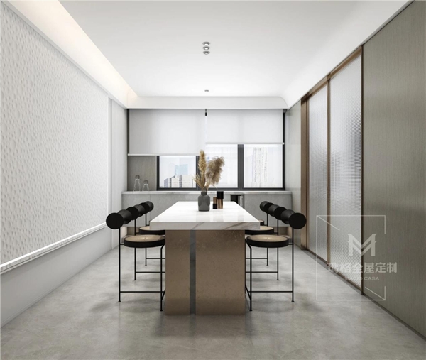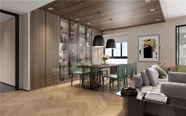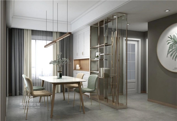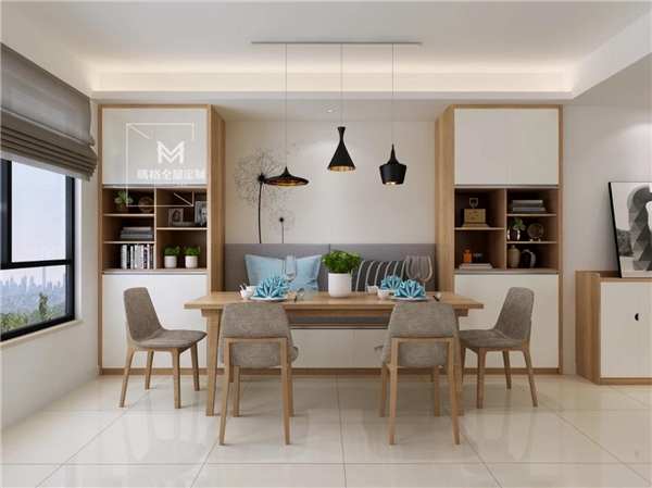 根据房型结构,如果餐厅靠窗,而且空间面积比较充裕的情况下,可设计一排矮柜作为餐边柜,这样既能增加储物空间,也不会挡住自然光的摄入,保证用餐空间的通透性。