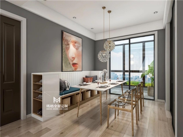 玄关型餐边柜,一来可以作为玄关隔断,避免“进门见厅”的尴尬,二来可以作为餐边柜使用,封闭+开放式结合设计,满足日常收纳需要;一柜两用,整体风格更加统一。
