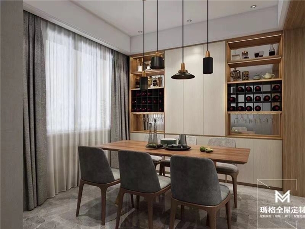 设计酒柜型餐边柜,封闭+开放式的结合,功能满足日常的收纳需要,酒杯、红酒等物品均可分类存放;简约大气时尚,为餐厅增添了高贵的品味。
