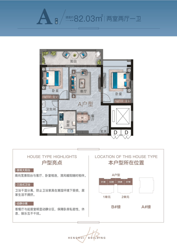 A户型:约82.03㎡,两房两厅一卫