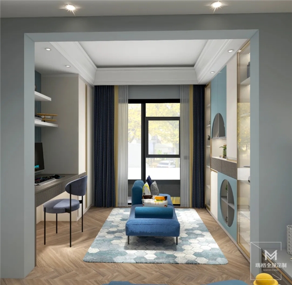 学习玩乐区分别设计两面收纳柜,半开合的设计,满足孩子的收纳需求;暖白色与湛蓝色交相融合,营造出灵动活泼的空间氛围。