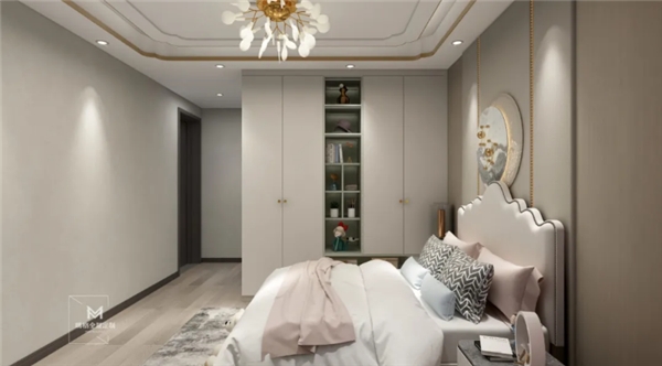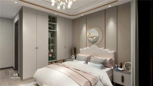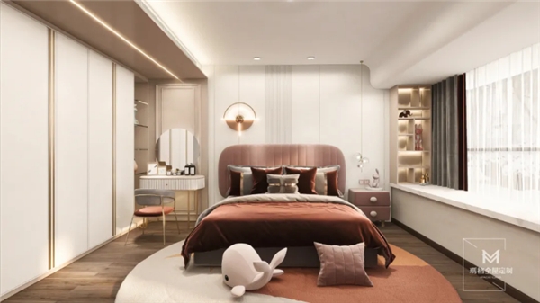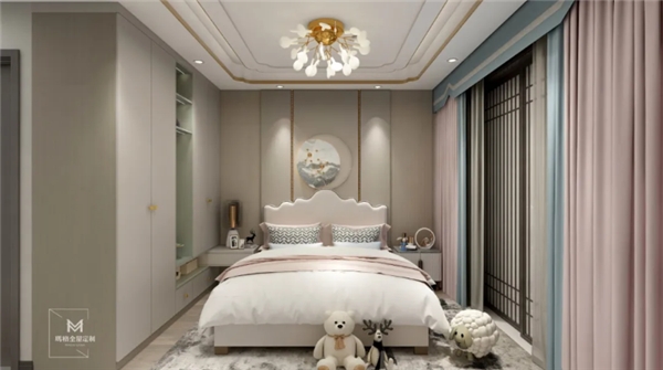 拥有欧式气质的公主房是每个女孩子心底的小期待,暖白的衣柜、背景墙在灯光的氤氲下,显得更加温润和谐;软糯舒适的床品,为空间增添一笔温柔;地毯上的玩偶满足女孩子的少女心,整体氛围饱满温和,气质满分。