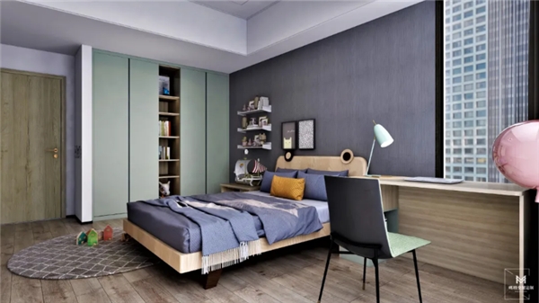 清新简约型的儿童房设计,集合了睡觉、玩耍、学习、收纳等功能;极简的衣柜、书桌、床品,让孩子的成长环境更简单;整体空间无过多浓烈的色彩,打造出利于孩子学习和休息的舒适环境。