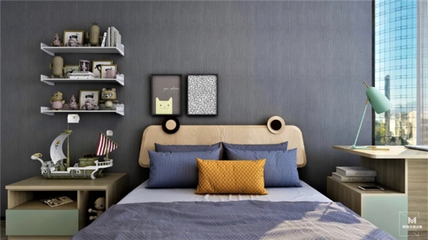 随着年龄的增长,大龄的孩子不再需要过多稚趣的玩具消磨时间,房间的设计上趋于简约,靠墙一侧打造置顶衣柜,中部镂空放入书籍,一柜两用更便捷;床头背景墙上设计开放式展架,方便孩子展示自己的小巧思;藏蓝色与灰湖绿碰撞,释放出沉稳温和的空间气质。