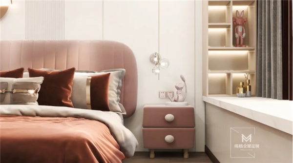 色彩是儿童开启认知天赋的排名前列扇窗口,所以儿童房的用色要充分考虑到孩子的兴趣喜好和对成长的激发效果。淡粉色满足女孩们对浪漫童话的想象,粉色的床品,粉色的矮柜,融入一张舒适地毯,打造一个高级粉嫩的公主房;暖白系的背景墙和衣柜,与粉色交相融合,整体空间舒缓梦幻。