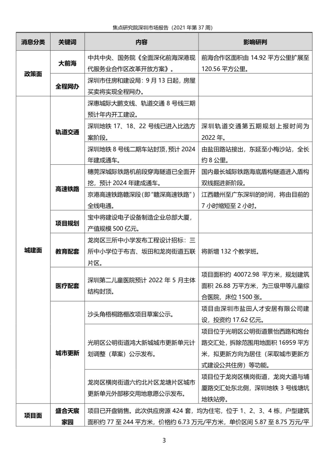 政策方面,当周,中共中央、国务院发布《全面深化前海深港现代服务业合作区改革开放方案》,将前海合作区打造成为粤港澳大湾区全面深化改革创新试验平台,建设高水平对外开放门户枢纽,并进一步扩展前海合作区发展空间,前海合作区面积由14.92平方公里扩展至120.56平方公里。深圳市住房和建设局发布《关于我市房屋交易管理业务调整的通告》,明确深圳市住房公积金管理中心承接房屋交易管理职能,并自2021年9月13日起首批推出房屋交易资格审查、房屋买卖合同网签备案以及出具购房资格证明等业务“全程网办”。