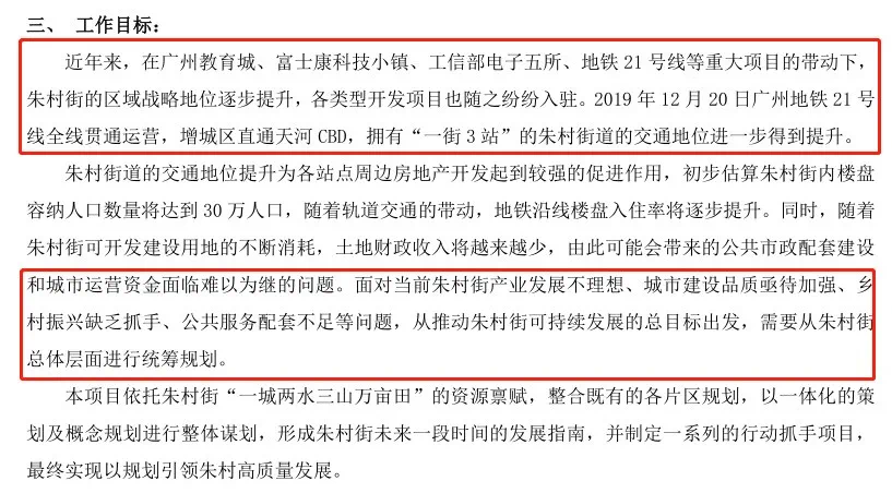 值得关注无疑是对片区规划文化项目、中小学、医院、商业等设施的用地。要知道,目前的朱村要说什么最缺,就是缺教育、缺商业,政府也深知此事,并在朱村街道总体策划与规划整合提升项目招标中提及此事。