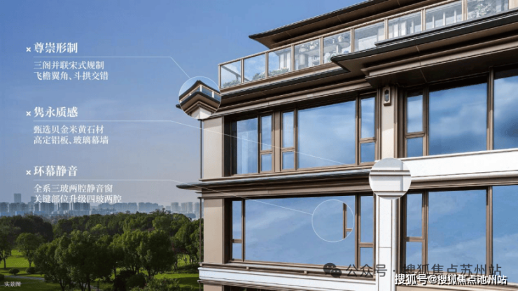 叠墅立面取苏州宋代壁画建筑为原型,运用“三阁并联”宋式尊崇规制,飞檐翼角、斗拱交错,再现江南楼阁门仪。整体甄选贝金米黄石材、高定铝板与玻璃幕墙,全系三玻两腔静音窗,关键部门升级为四玻两腔,为世家呈现宽阔而静谧的奢居之境。